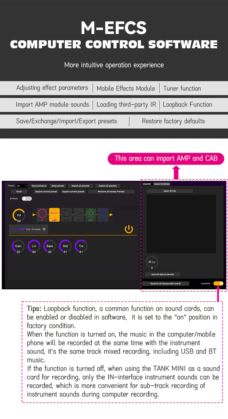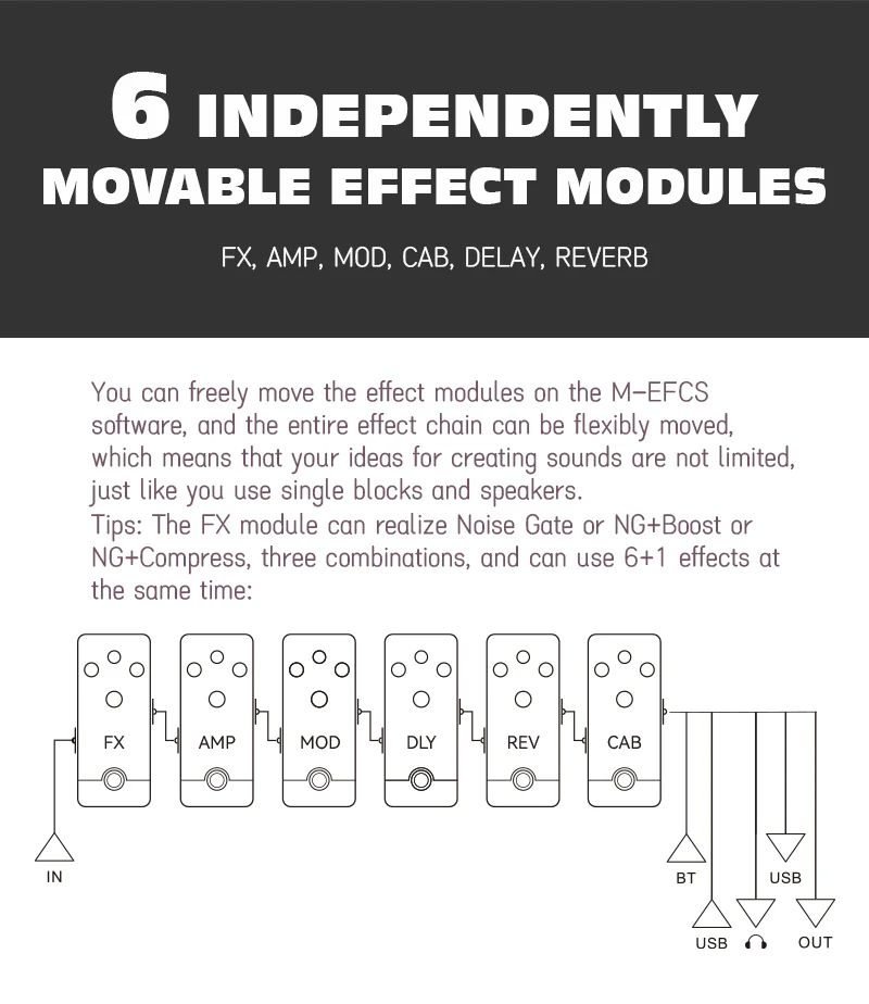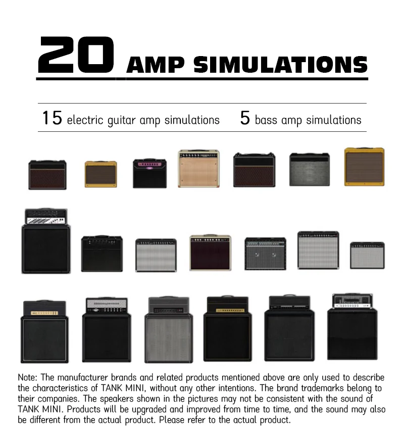 – 21 cài đặt trước có thể chỉnh sửa/ Cổng tiếng ồn/ Tăng cường/ Nén/ EQ 3 băng tần/ 7 điều chế/ 5 độ trễ/ 6 hiệu ứng hồi âm/ 20 bộ tiền khuếch đại/ 20 bộ CAB hồng ngoại/ một bộ chỉnh âm