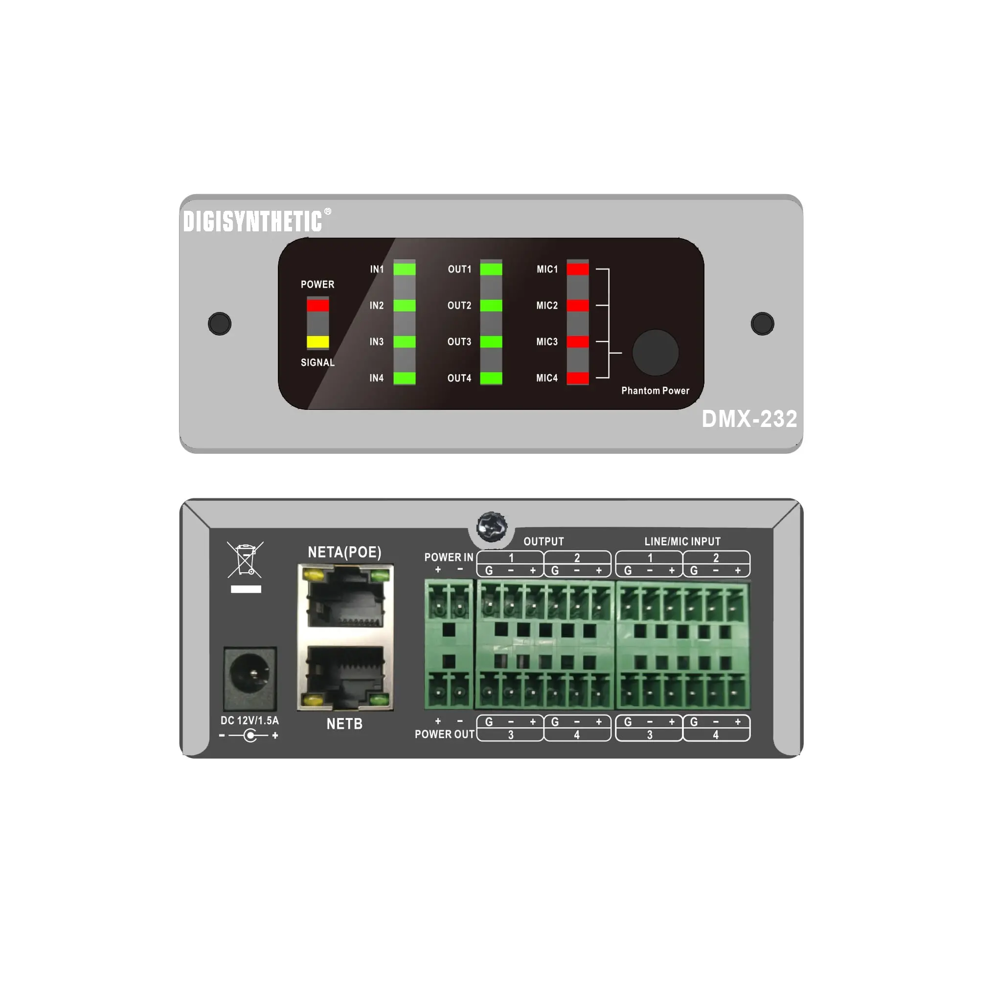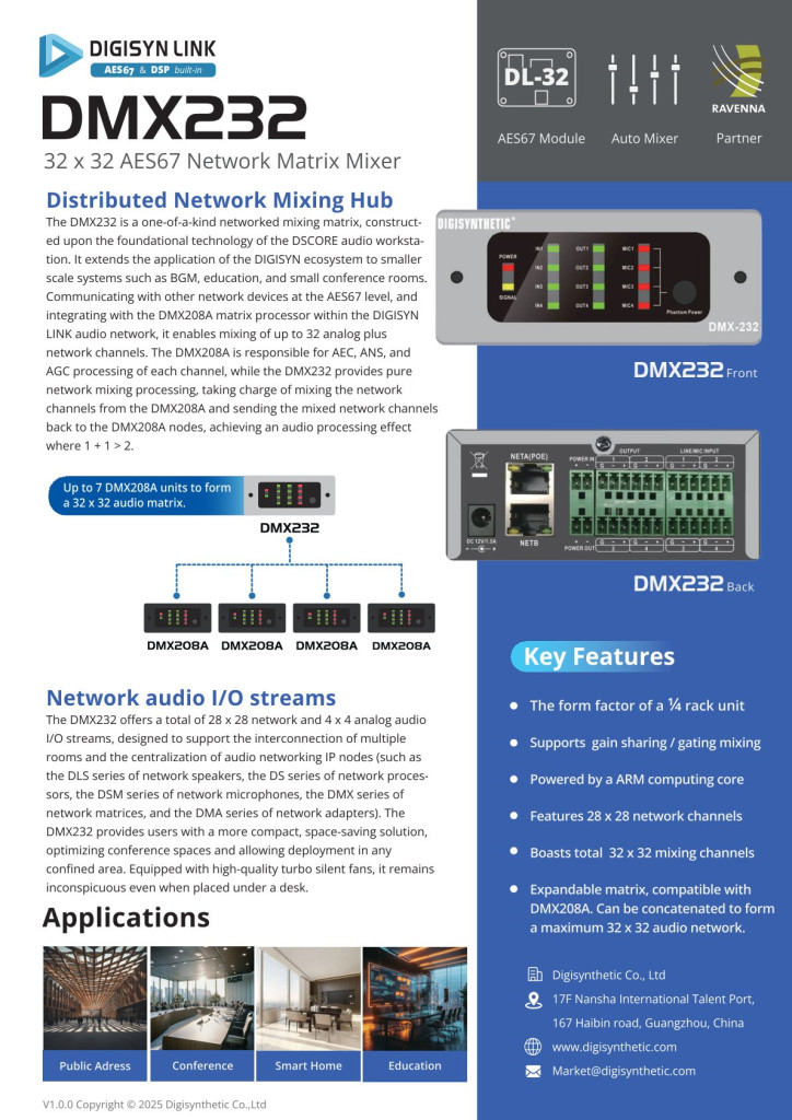 DMX232 là bộ xử lý âm thanh mạng hoặc hộp sân khấu, có thể giao tiếp với các thiết bị mạng khác dựa trên giao thức AES67.
