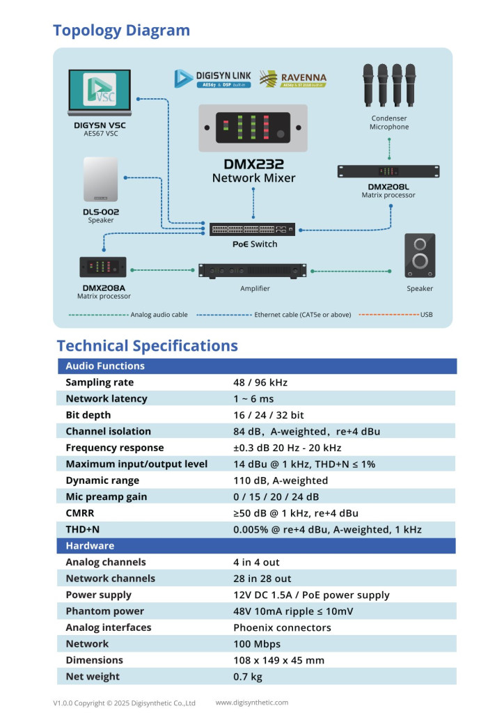 Sử dụng giao thức AES67 và cung cấp các chức năng DSP mạnh mẽ với hỗ trợ nâng cấp và ghép nối OTA.